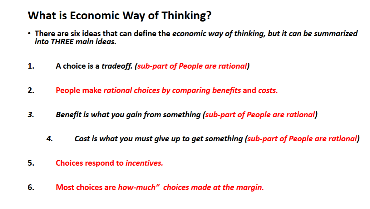 原文 (Original): There are six ideas that can define the economic way of thinking, but it can be summarized into THREE main ideas.