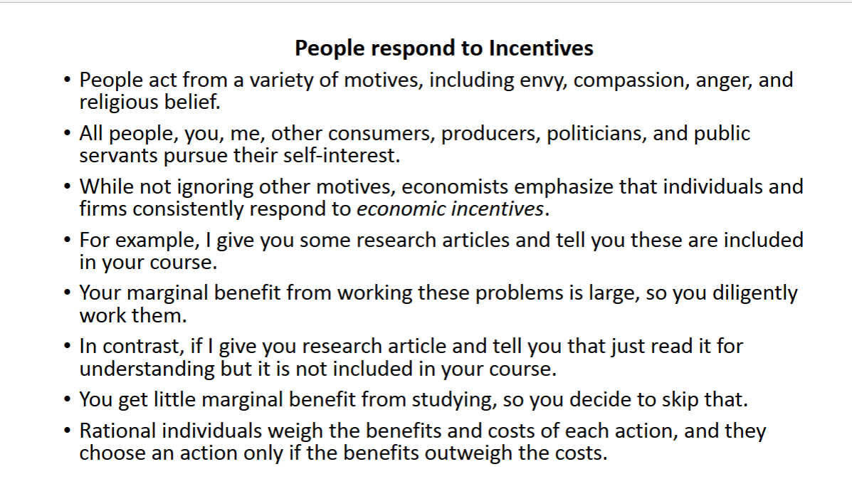 原文 (Original): While not ignoring other motives, economists emphasize that individuals and firms consistently respond to economic incentives.