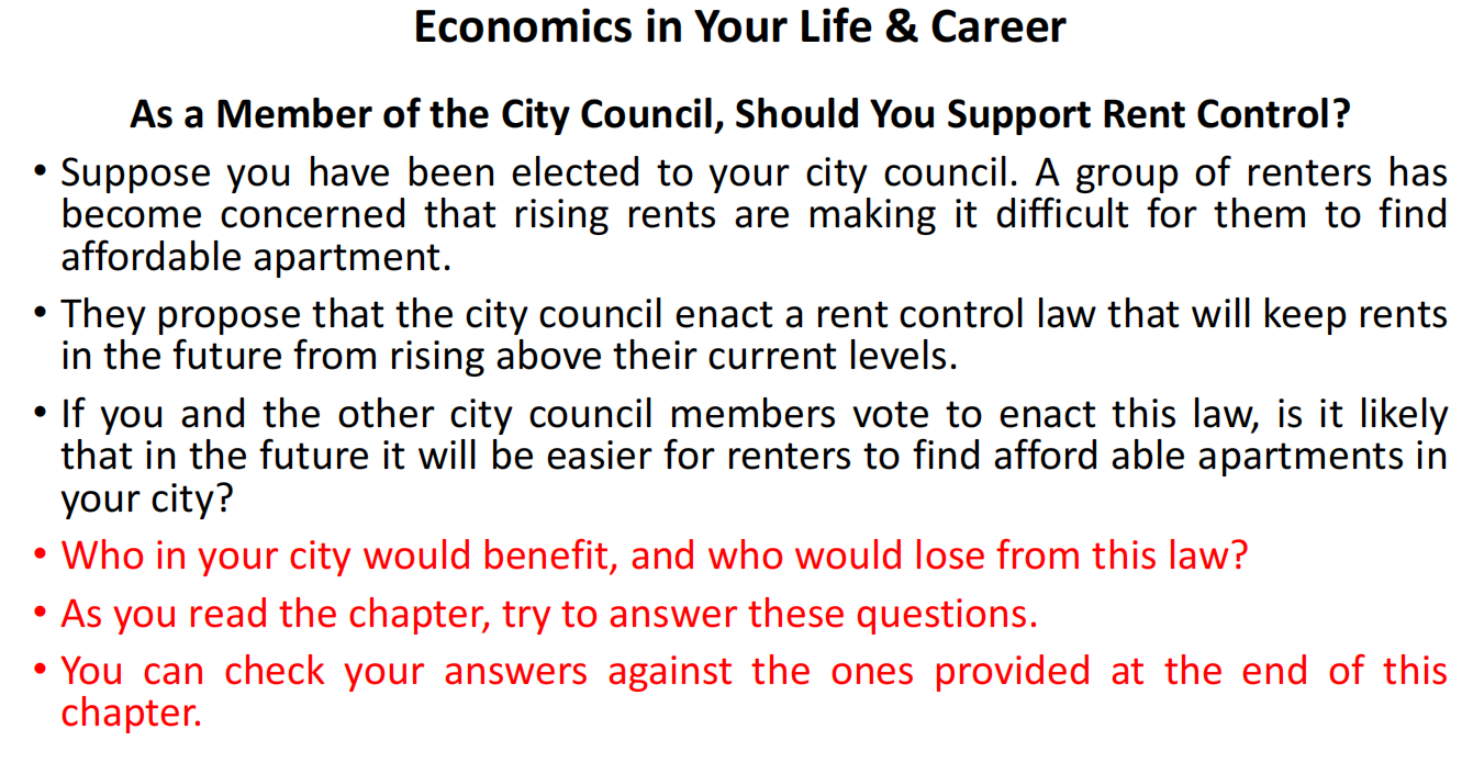 Suppose you have been elected to your city council. A group of renters has become concerned that rising rents are making it difficult for them to find affordable apartments.