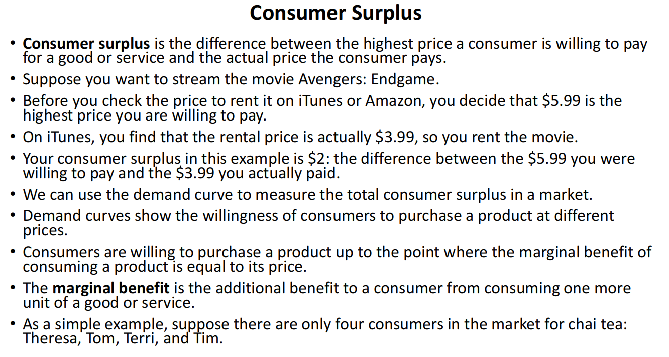 Consumer surplus is the difference between what consumers are willing to pay and what they actually pay.