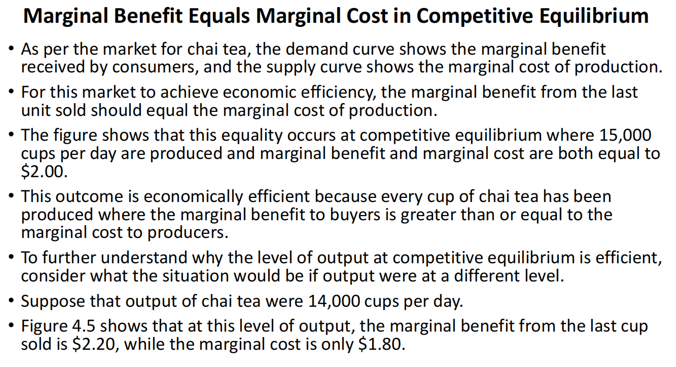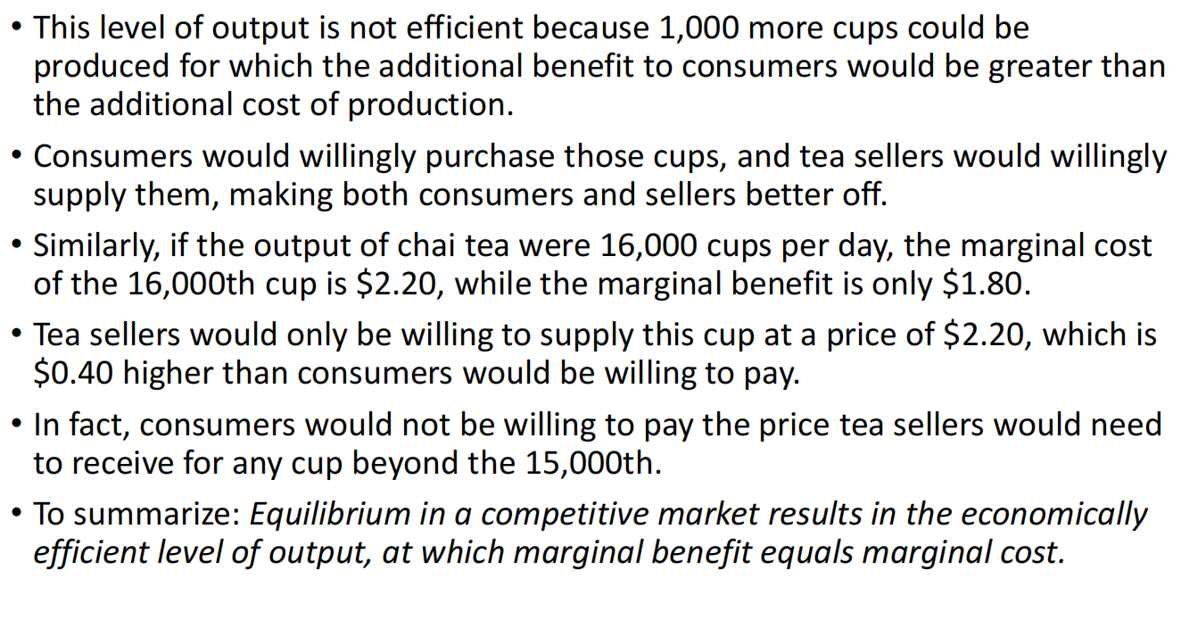 This outcome is economically efficient because every cup of chai tea has been produced where the marginal benefit to buyers is greater than or equal to the marginal cost to producers.