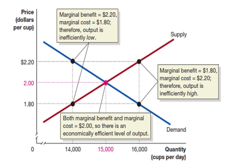 The figure shows that this equality occurs at competitive equilibrium where 15,000 cups per day are produced and marginal benefit and marginal cost are both equal to $2.00.