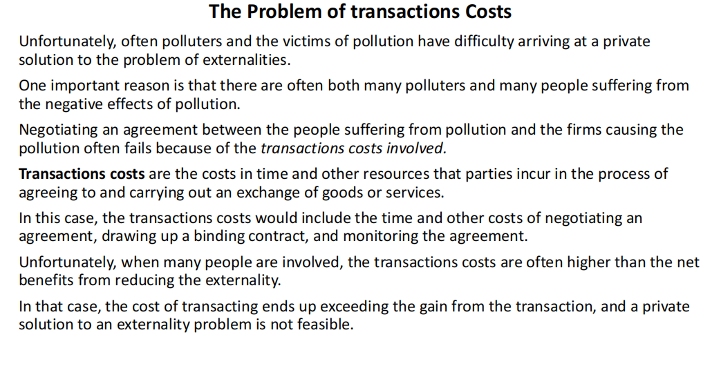 Unfortunately, when many people are involved, the transactions costs are often higher than the net benefits from reducing the externality.