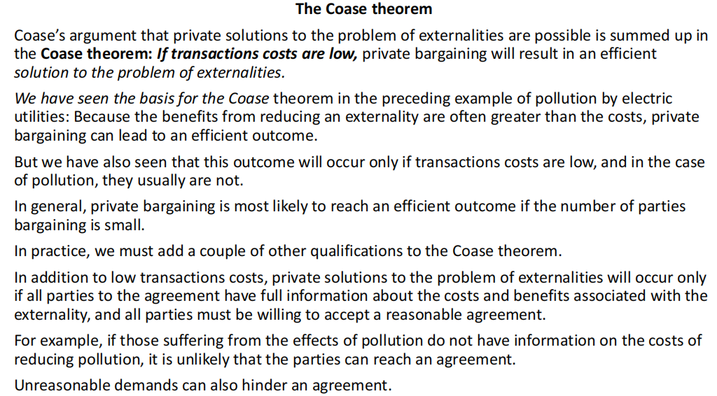 (科斯定理指出,如果交易成本较低且产权明晰,私下谈判可以高效解决外部性问题。)