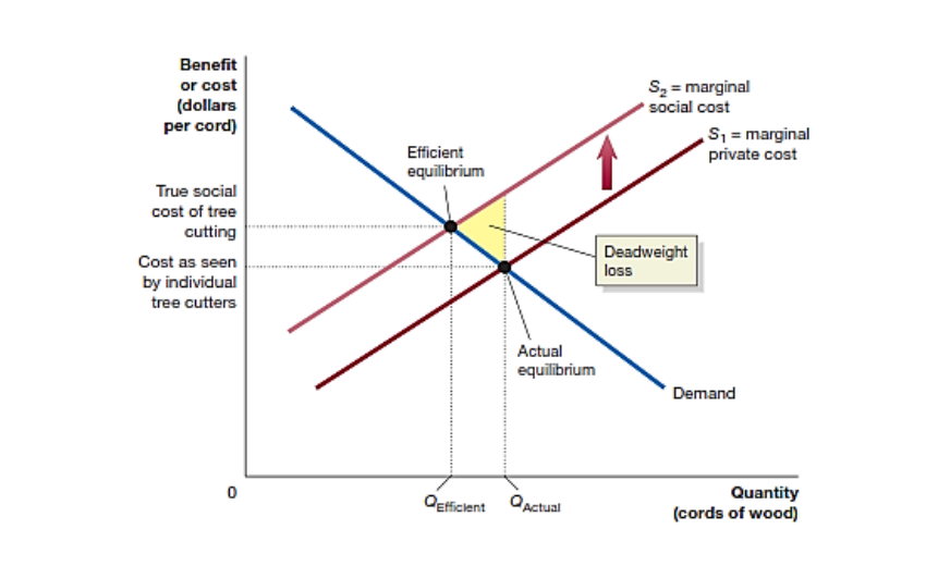 正如我们讨论负外部性的情况一样,社会成本等于砍伐木材的私人成本加上外部成本。