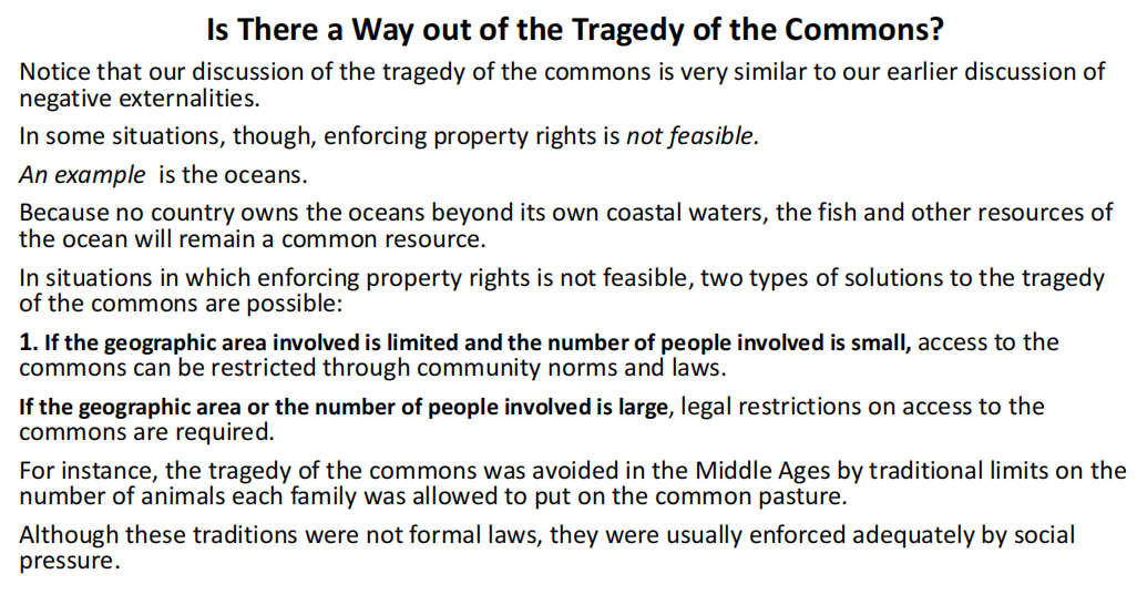 • In situations in which enforcing property rights is not feasible, two types of solutions to the tragedy of the commons are possible: