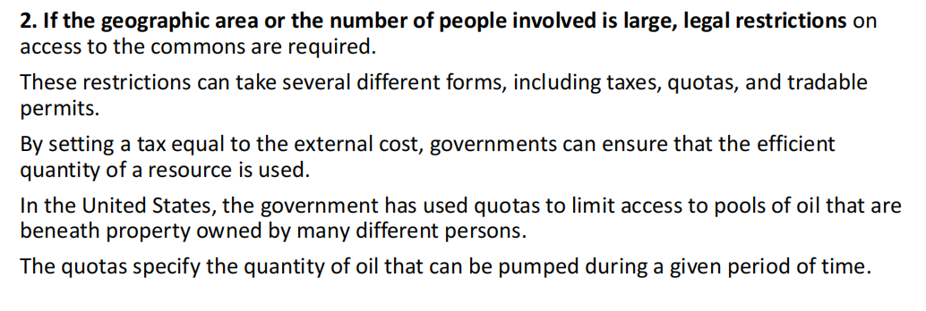 (当一个资源被广泛共享且难以执行产权时,税收、配额和可交易许可证等法律限制是管理访问和确保高效使用所必需的。)