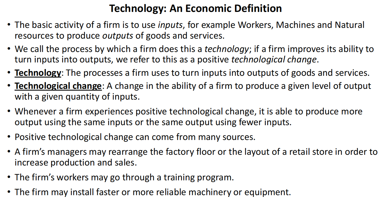 We call the process by which a firm does this a technology; if a firm improves its ability to turn inputs into outputs, we refer to this as a positive technological change.