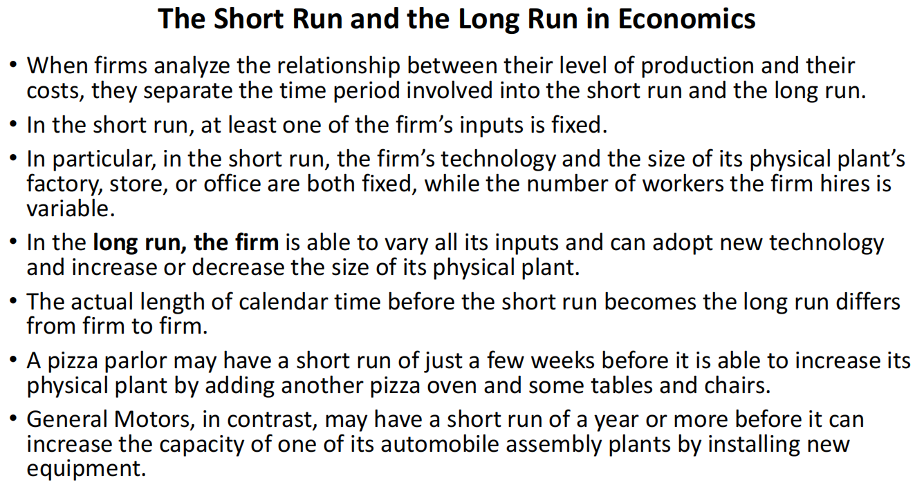 When firms analyze the relationship between their level of production and their costs, they separate the time period involved into the short run and the long run.
