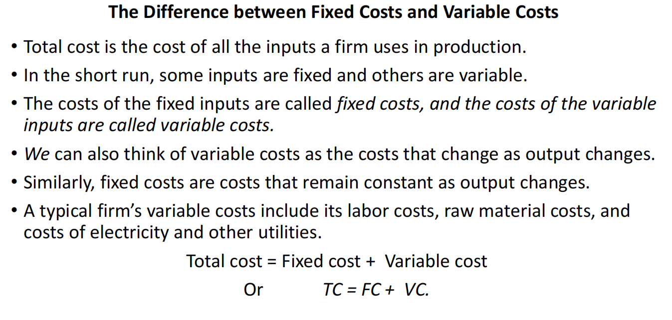 The costs of the fixed inputs are called fixed costs, and the costs of the variable inputs are called variable costs.