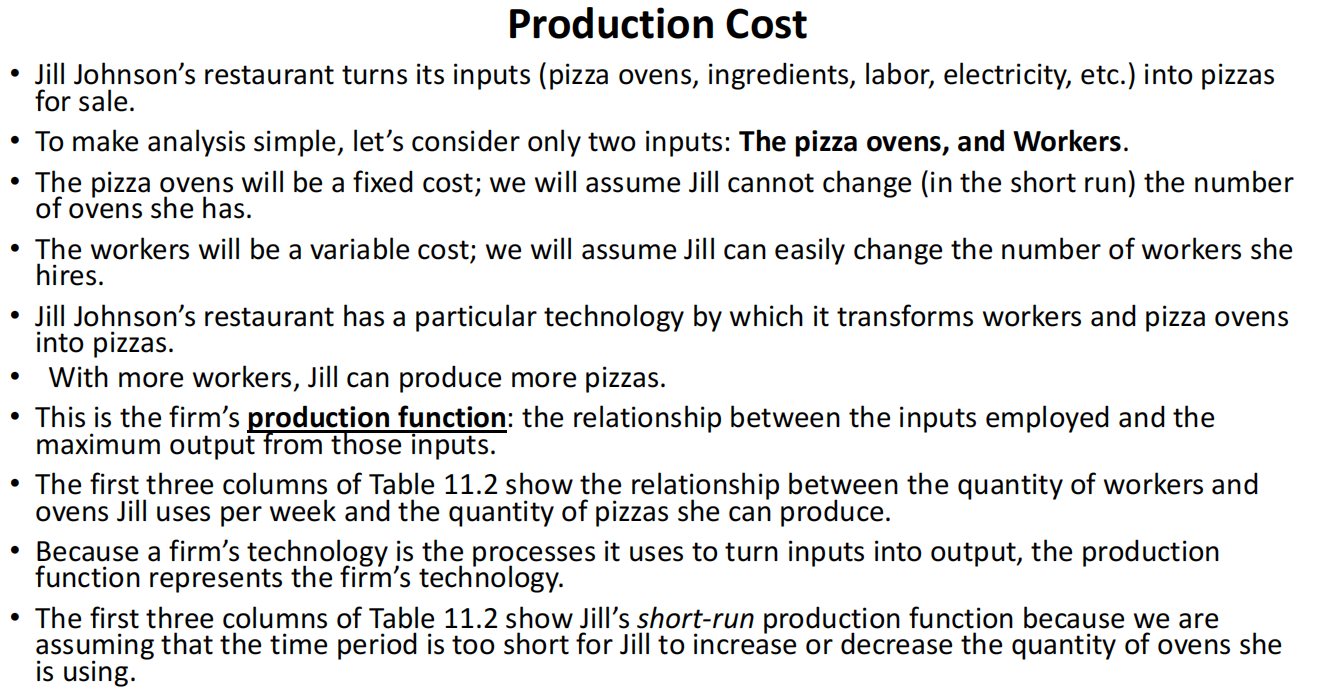 The first three columns of Table 11.2 show Jill’s short-run production function because we are assuming that the time period is too short for Jill to increase or decrease the quantity of ovens she is using.