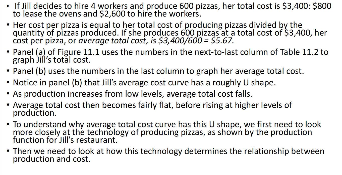 If Jill decides to hire 4 workers and produce 600 pizzas, her total cost is 800 to lease the ovens and $2,600 to hire the workers.