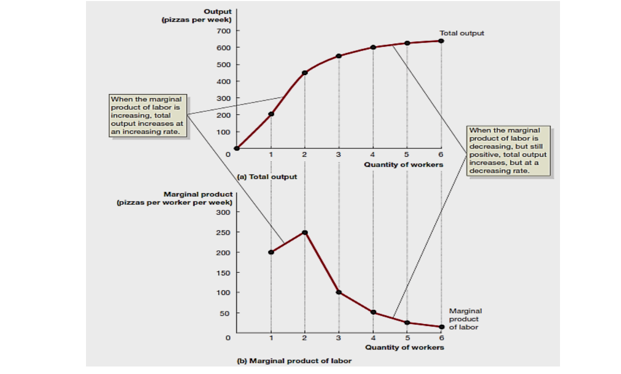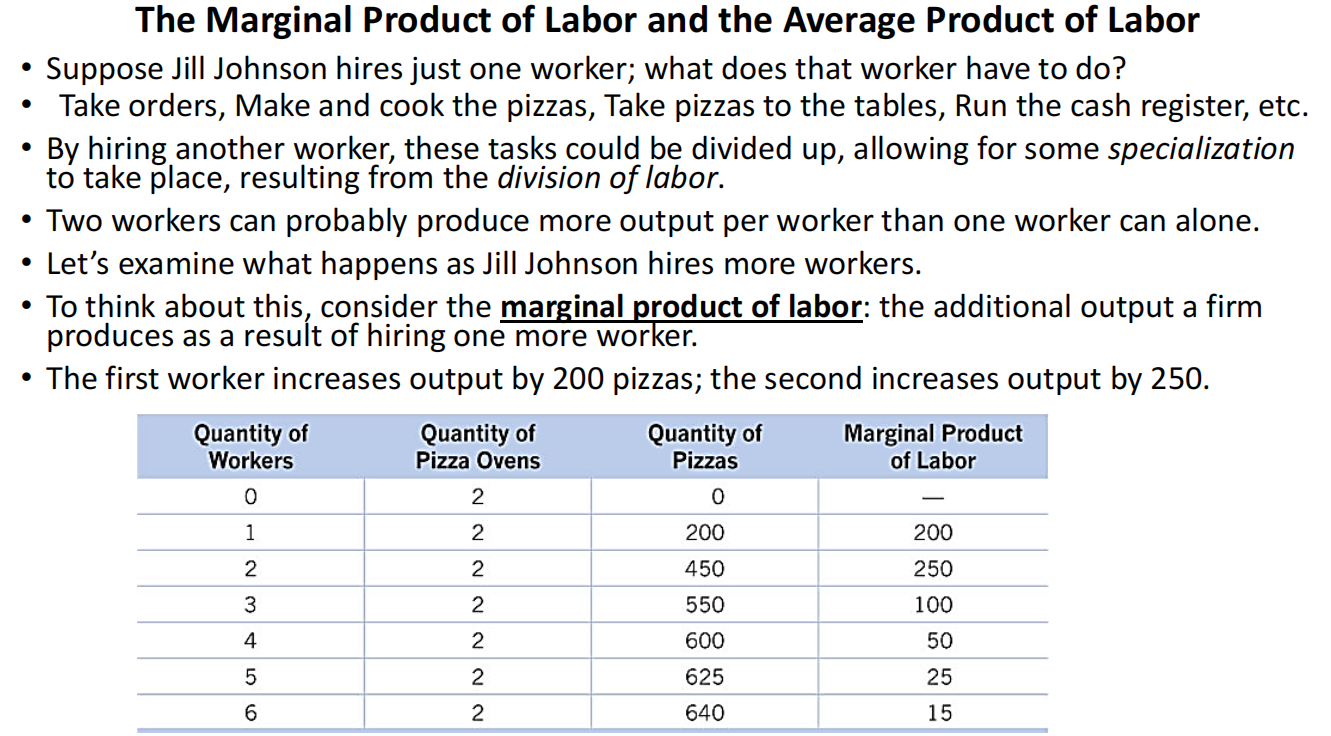 (随着Jill雇佣更多工人,由于烤箱和设备数量固定,每个额外的工人对比萨总产出的贡献会减少。)