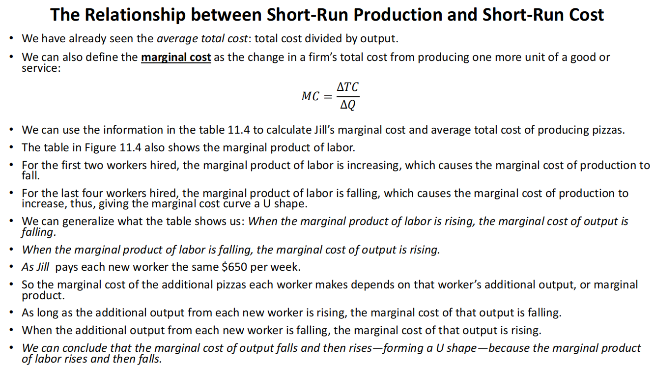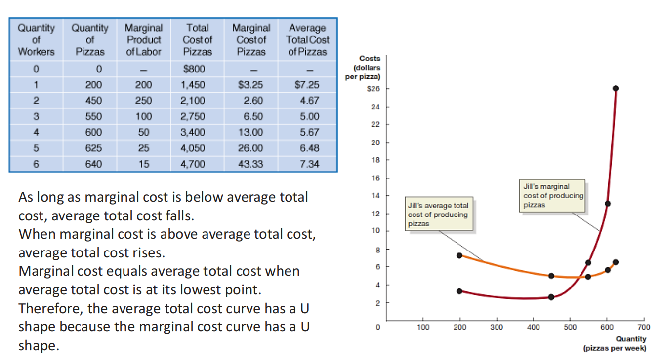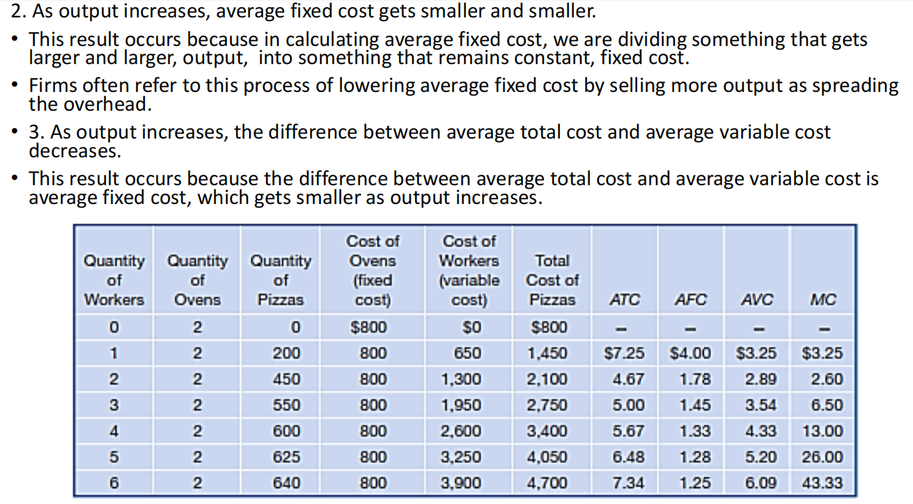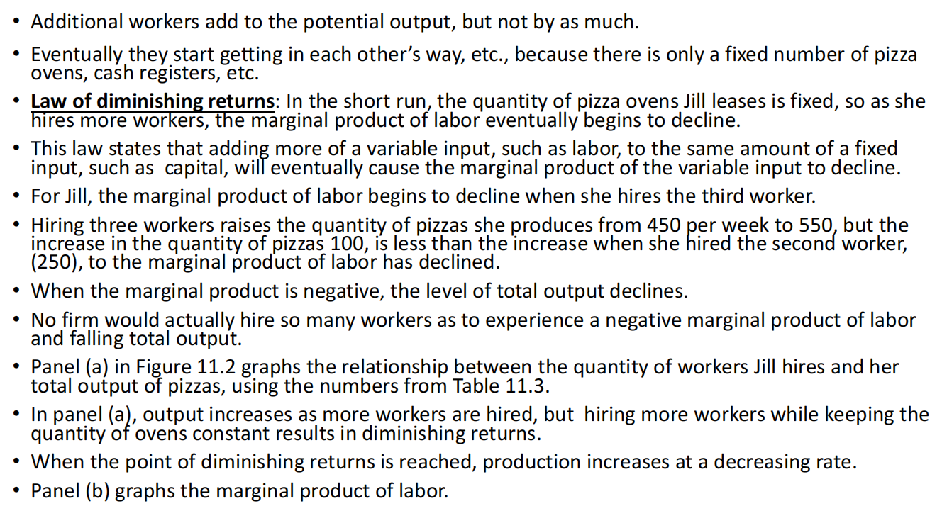递减收益法则:在短期内,Jill租赁的比萨烤箱数量是固定的,因此随着她雇佣更多工人,劳动的边际产量最终开始下降。