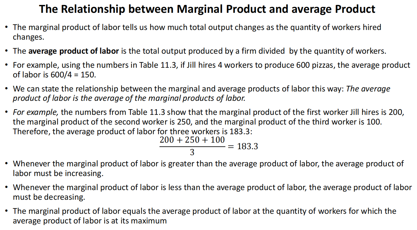 For example, using the numbers in Table 11.3, if Jill hires 4 workers to produce 600 pizzas, the average product of labor is 600/4 = 150.