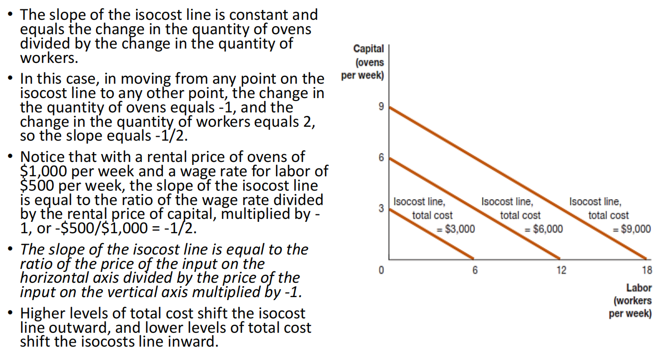 Notice that with a rental price of ovens of 500 per week, the slope of the isocost line is equal to the ratio of the wage rate divided by the rental price of capital, multiplied by -1, or -1,000 = -1/2.