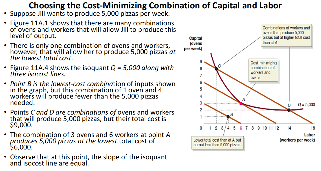 B点是图中显示的最低成本投入组合,但这种1个烤箱和4个工人的组合将生产少于5,000个比萨饼。
