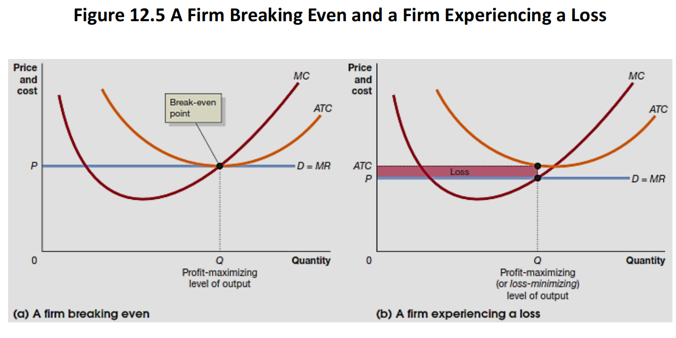 在图12.5的(a)图中,在 MR = MC 的产量水平下,价格等于平均总成本。因此,总收入等于总成本,企业实现盈亏平衡,经济利润为零。