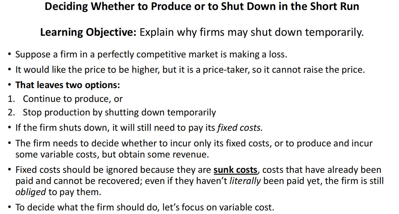 If the firm shuts down, it will still need to pay its fixed costs. The firm needs to decide whether to incur only its fixed costs, or to produce and incur some variable costs, but obtain some revenue.