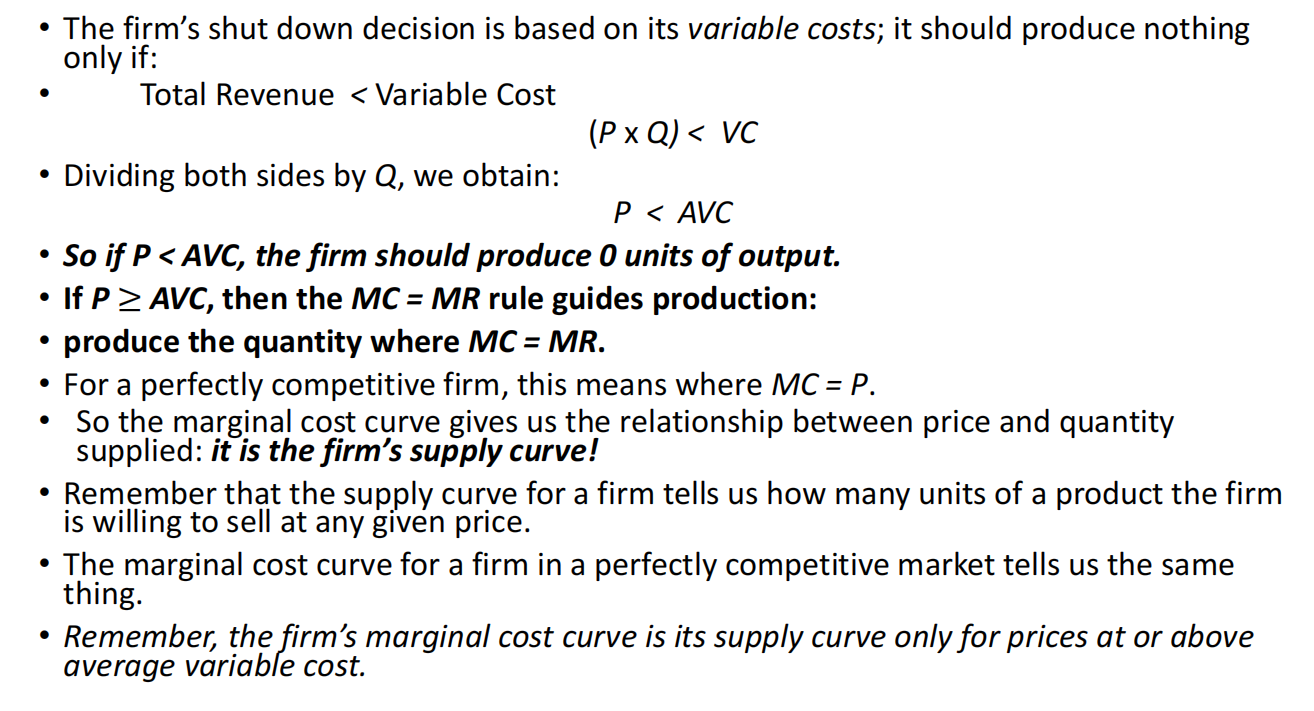 If P ≥ AVC, then the MC = MR rule guides production: produce the quantity where MC = MR. For a perfectly competitive firm, this means where MC = P.
