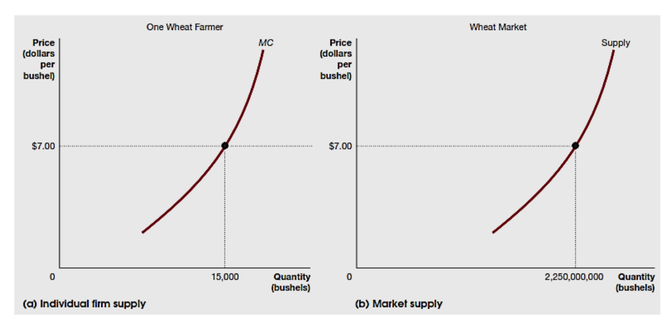 The market supply curve is determined by adding up the quantity supplied by each firm in the market at each price. Each firm’s marginal cost curve tells us how much that firm will supply at each price. So, the market supply curve can be derived directly from the marginal cost curves of the firms in the market.