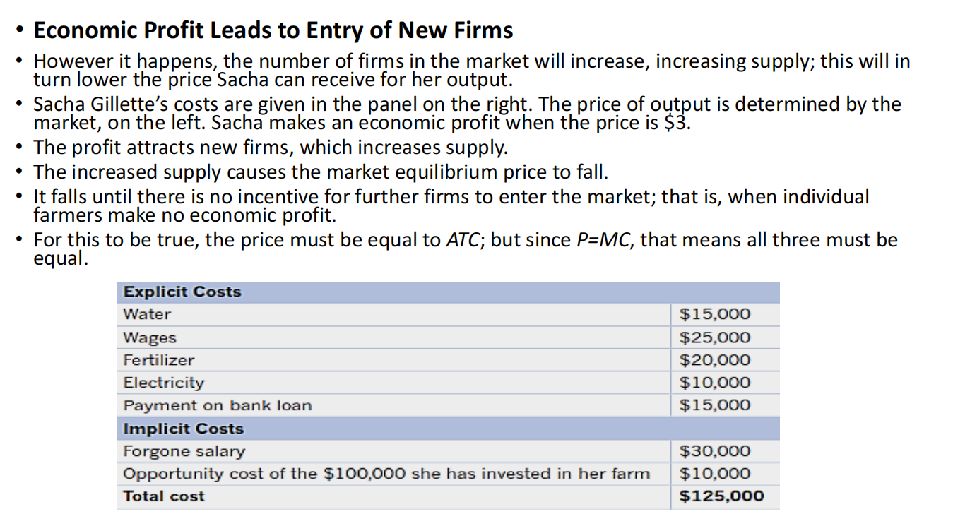 (若企业获利,新企业进入 → 供给增加 → 价格下降 → 无经济利润。)