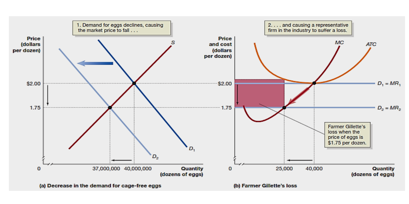 Panel (b) shows a decrease in demand from D1 to D2 which causes the market price to fall temporarily from $2 per dozen to $1.75.