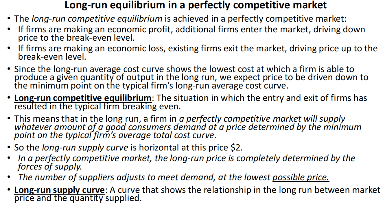 In a perfectly competitive market, the long-run price is completely determined by the forces of supply.