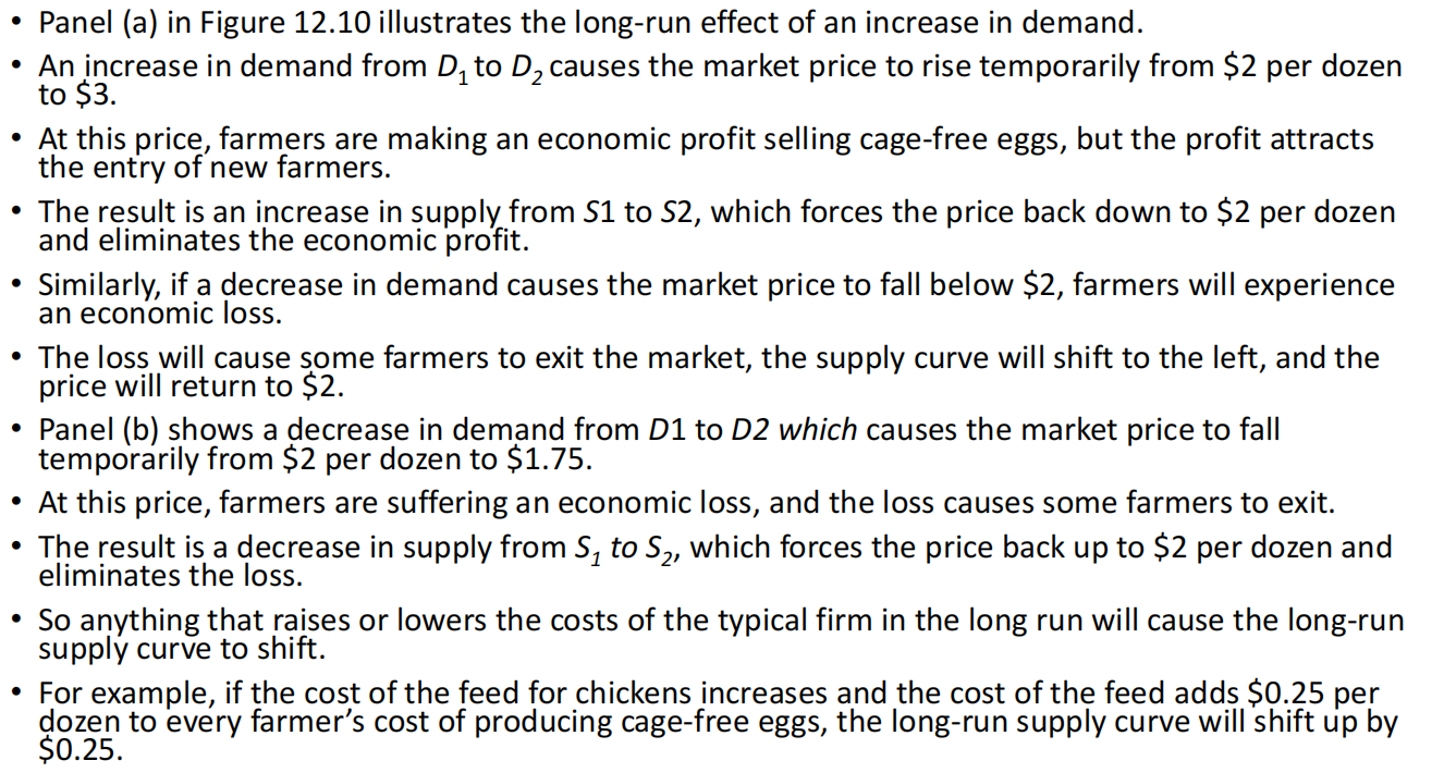 For example, if the cost of the feed for chickens increases and the cost of the feed adds $0.25 per dozen to every farmer’s cost of producing cage-free eggs, the long-run supply curve will shift up by $0.25.