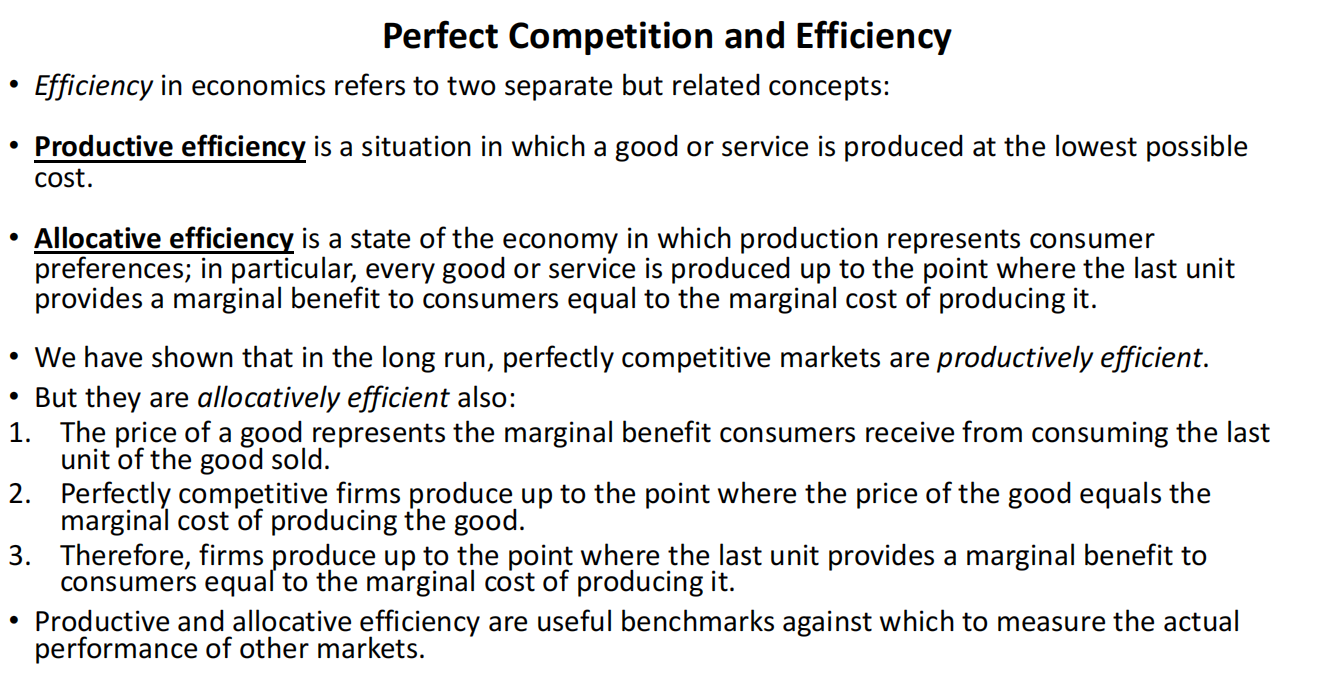 We have shown that in the long run, perfectly competitive markets are productively efficient.