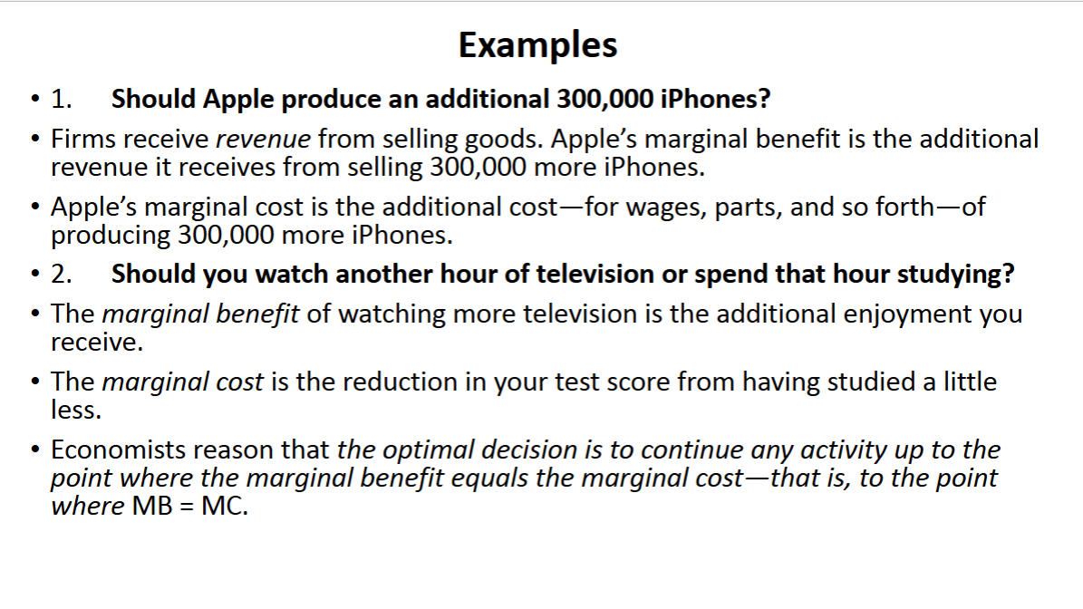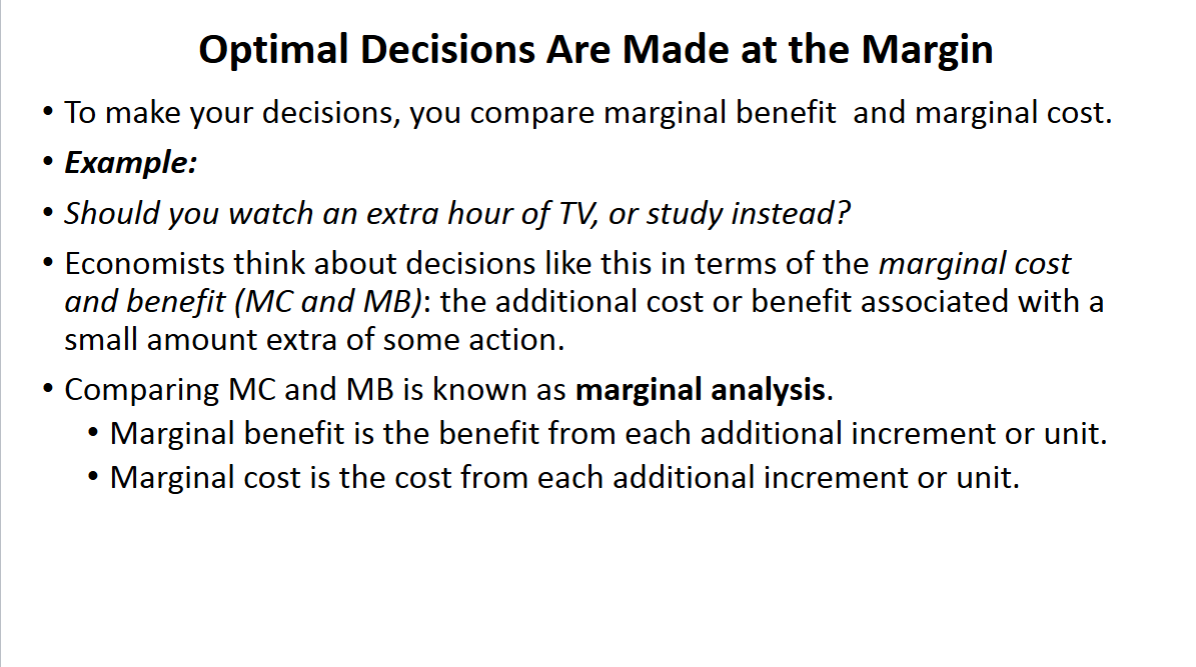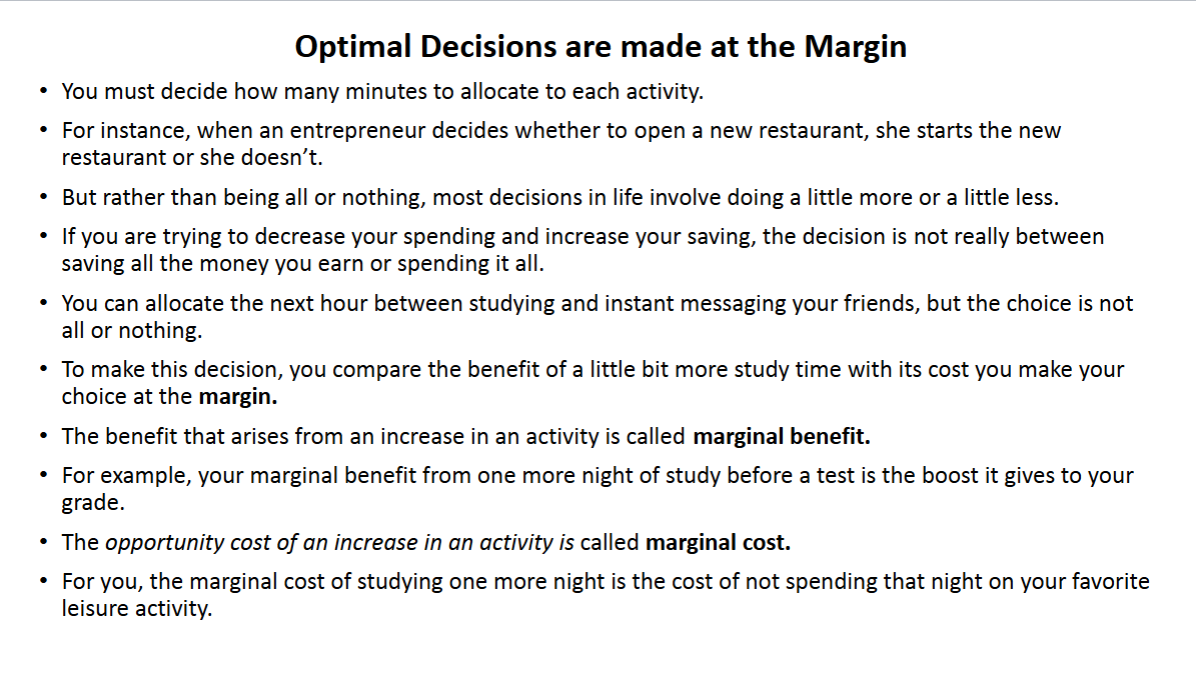 To make this decision, you compare the benefit of a little bit more study time with its cost you make your choice at the margin.