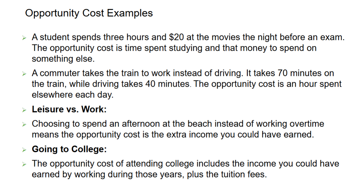 If you decide to study instead of going to a concert, the opportunity cost is the enjoyment and experiences you missed at the concert.