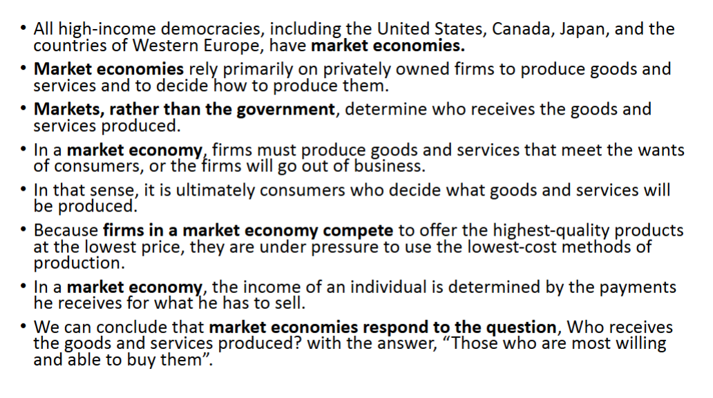We can conclude that market economies respond to the question, Who receives the goods and services produced? with the answer, “Those who are most willing and able to buy them”.
