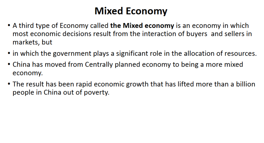A third type of Economy called the Mixed economy is an economy in which most economic decisions result from the interaction of buyers and sellers in markets, but in which the government plays a significant role in the allocation of resources.