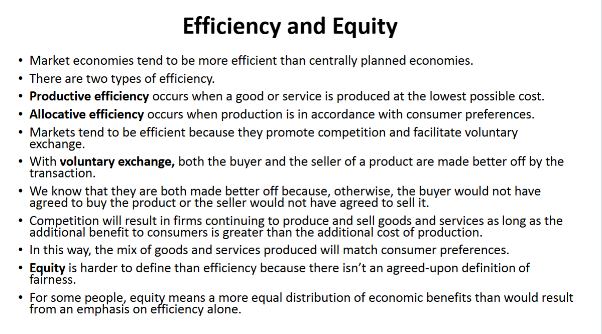 Efficiency in economics refers to how well resources are used to meet consumer needs. Productive efficiency is when goods are made at the lowest cost, and allocative efficiency occurs when resources are allocated according to consumer preferences.