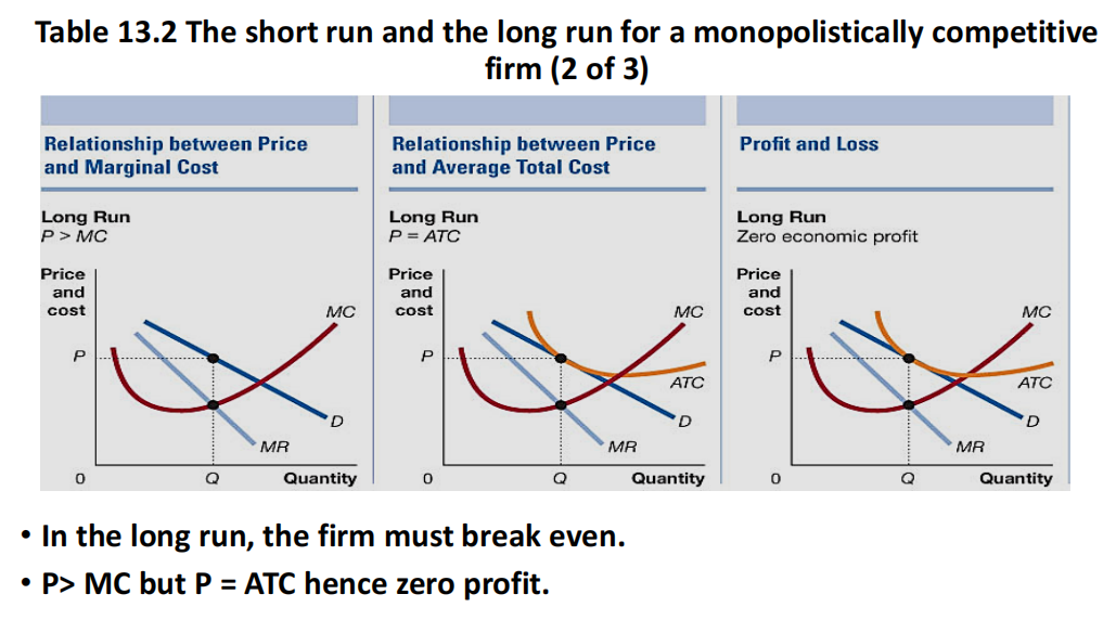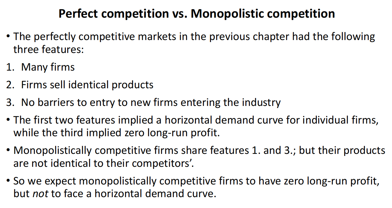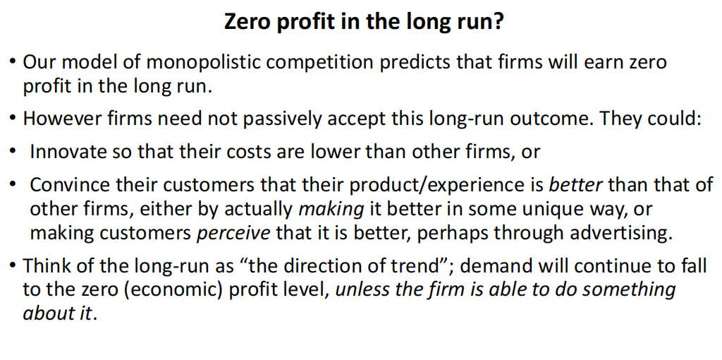 So we expect monopolistically competitive firms to have zero long-run profit, but not to face a horizontal demand curve.