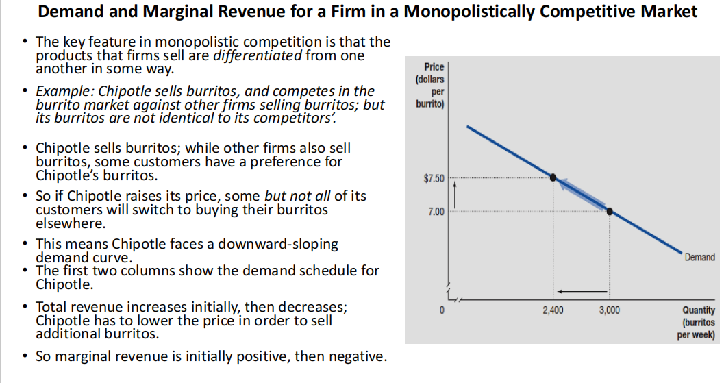 (与完全竞争不同,垄断性竞争中的企业由于产品差异化,会面对一条向下倾斜的需求曲线。)