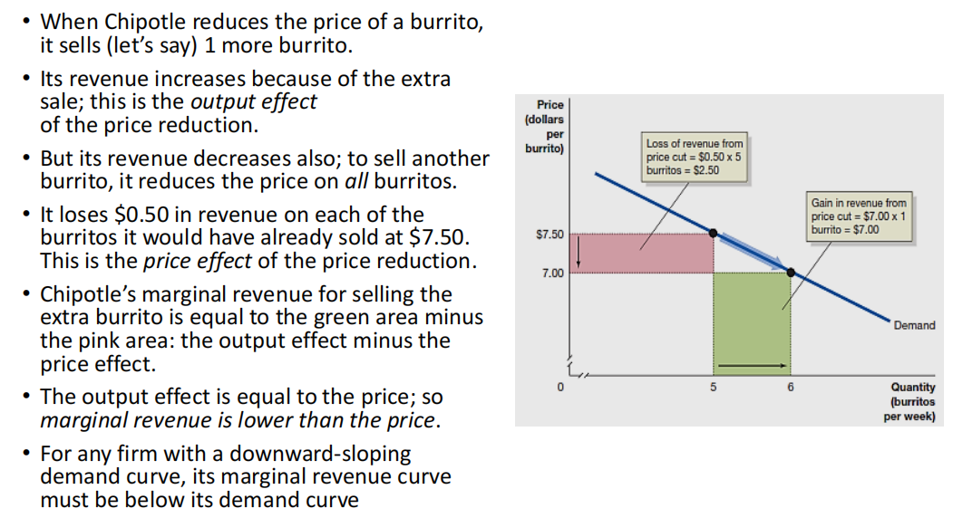 Chipotle’s marginal revenue for selling the extra burrito is equal to the green area minus the pink area: the output effect minus the price effect.