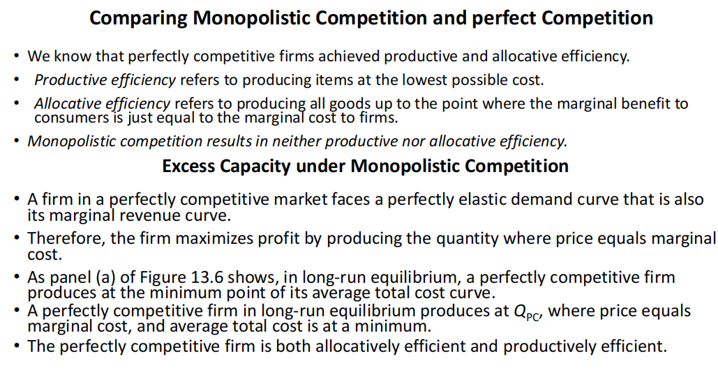 (完全竞争因价格接受者行为和缺乏市场势力而独特地实现了这两种效率,而垄断竞争因产品差异化和需求曲线向下倾斜而未能实现。)