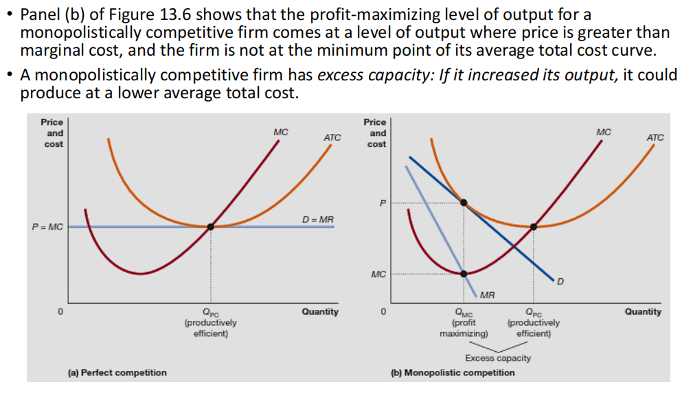 (垄断竞争企业的生产量低于其平均总成本最低点,导致过剩产能和比完全竞争企业更高的平均成本。)