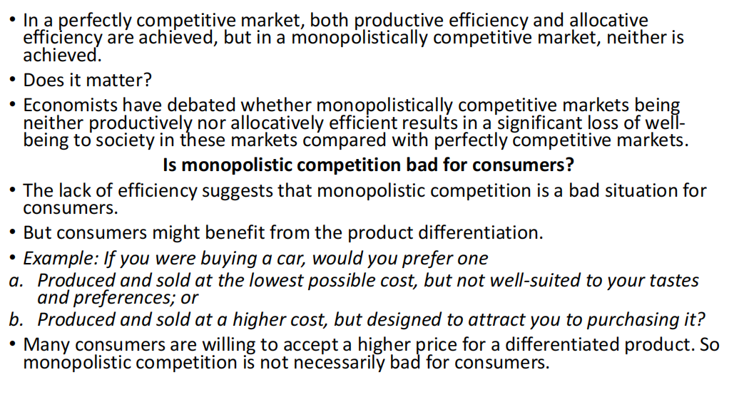 Many consumers are willing to accept a higher price for a differentiated product. So monopolistic competition is not necessarily bad for consumers.