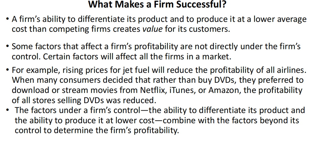 • A firm’s ability to differentiate its product and to produce it at a lower average cost than competing firms creates value for its customers.