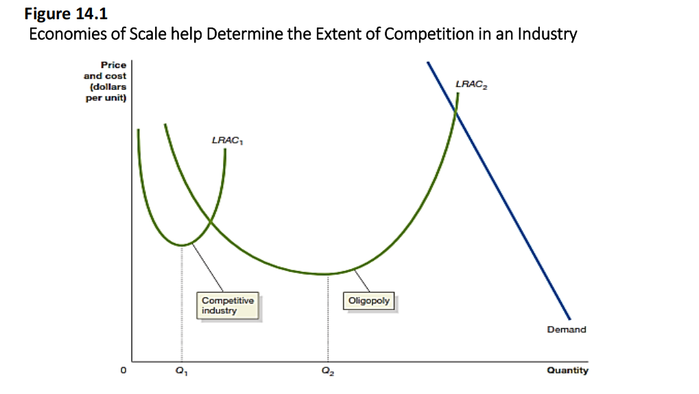 如果规模经济显著,企业必须生产行业中较大比例的产量才能达到最低平均成本,这将导致行业成为寡头垄断。