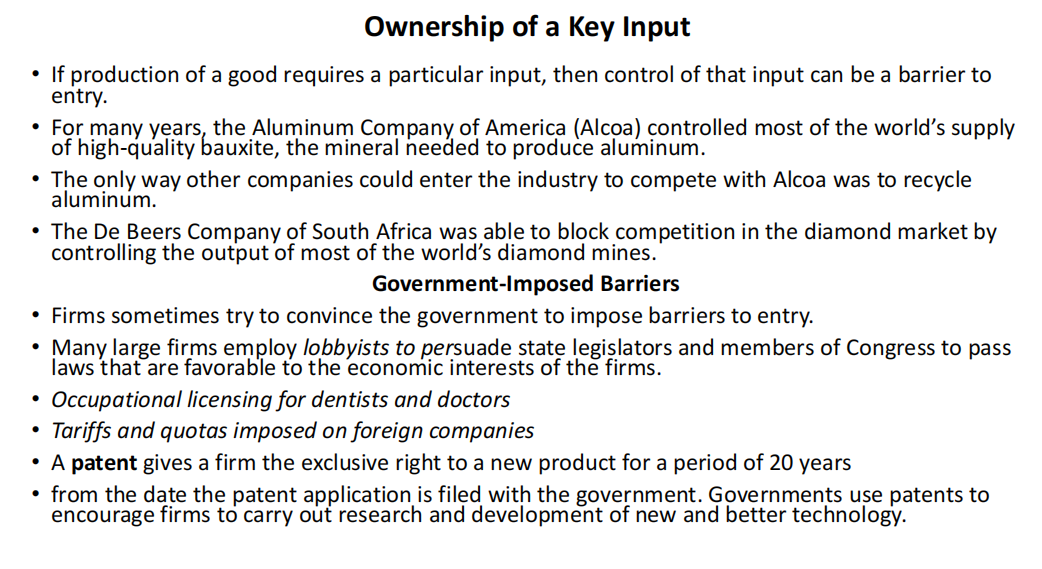 Three important barriers to entry are economies of scale, ownership of a key input, and government-imposed barriers.