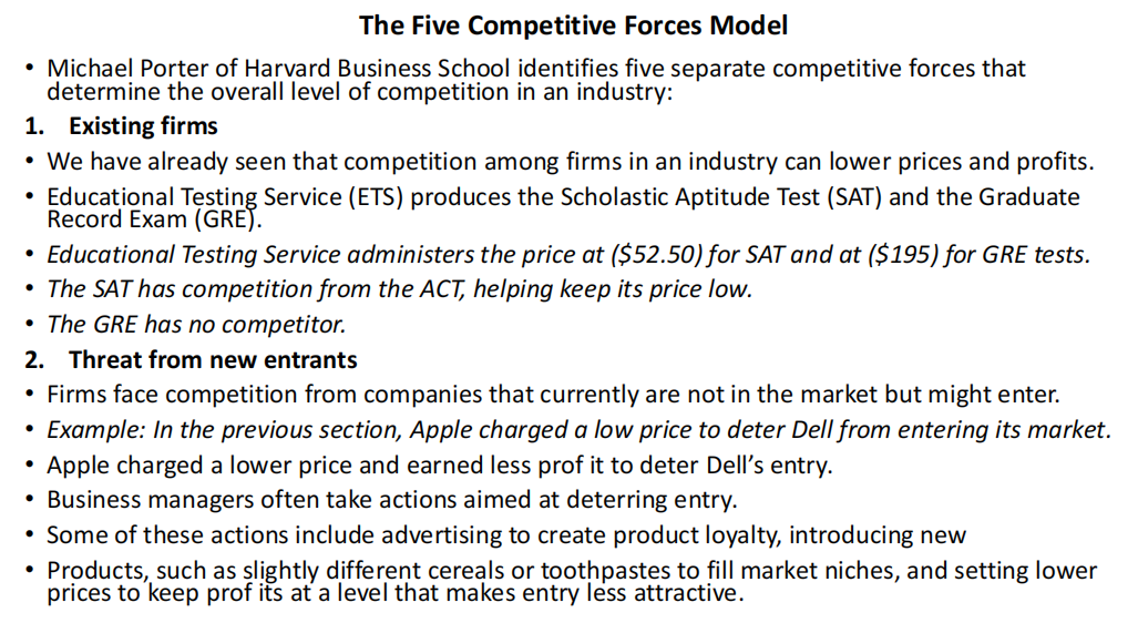 • Michael Porter of Harvard Business School identifies five separate competitive forces that determine the overall level of competition in an industry: