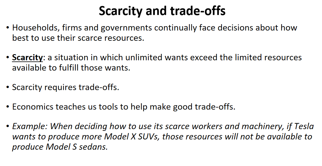 Example: When deciding how to use its scarce workers and machinery, if Tesla wants to produce more Model X SUVs, those resources will not be available to produce Model S sedans.