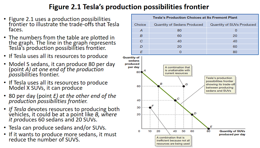 Figure 2.1 uses a production possibilities frontier to illustrate the trade-offs that Tesla faces.