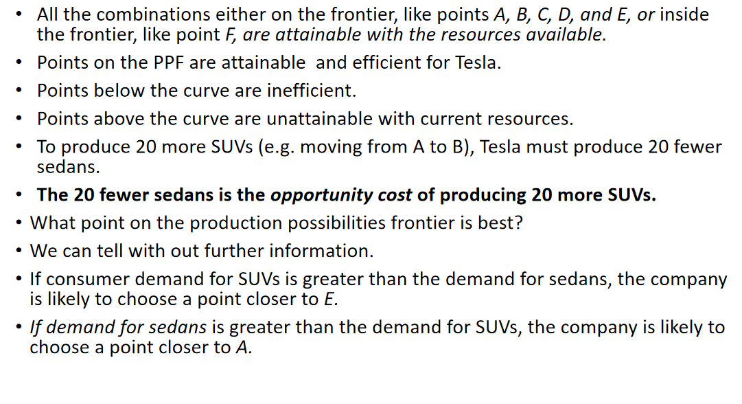 If Tesla uses all its resources to produce Model X SUVs, it can produce 80 per day (point E) at the other end of the production possibilities frontier.