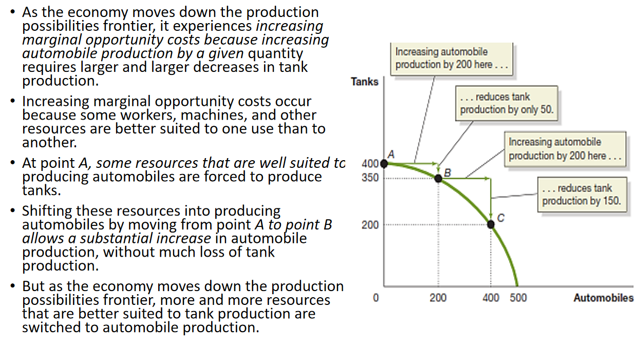 Example: The steeper the PPF, the higher the opportunity cost of the good on the x-axis.