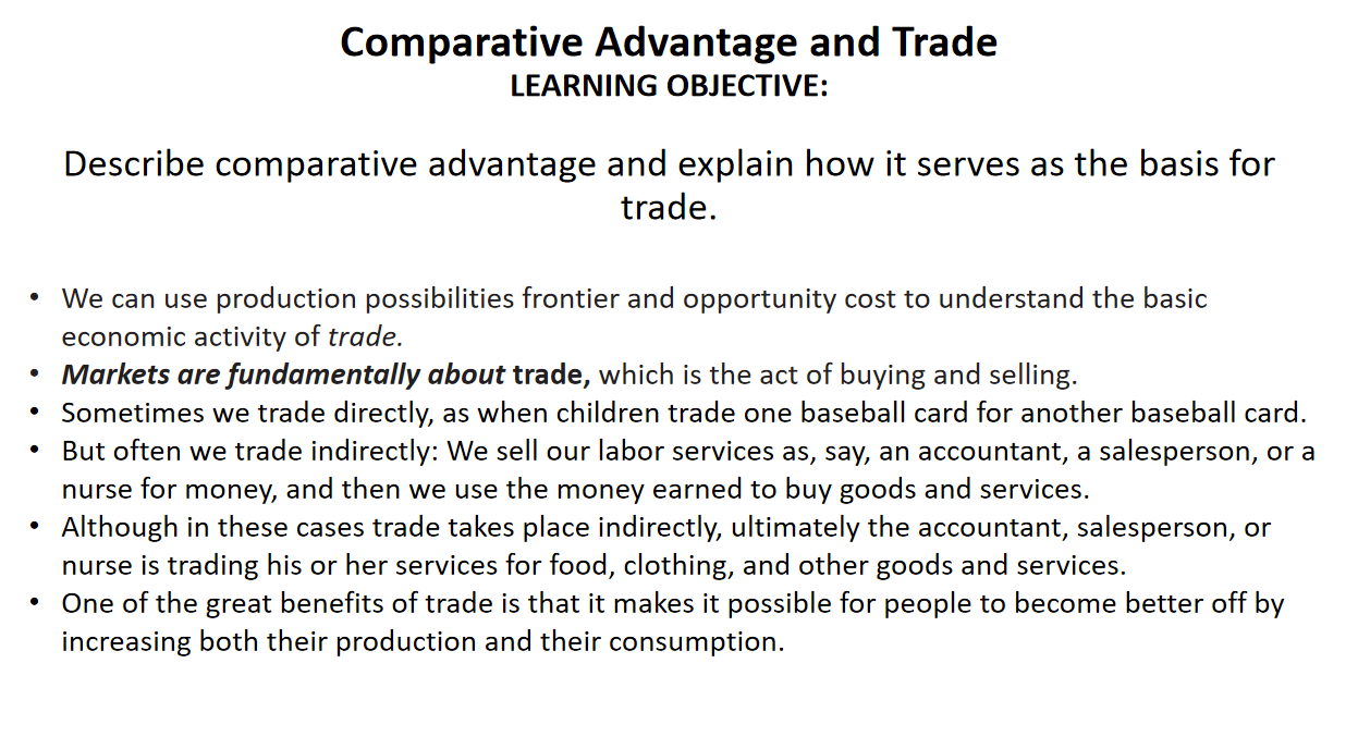 Trade is based on comparative advantage, which means focusing on what one does best at a lower opportunity cost.